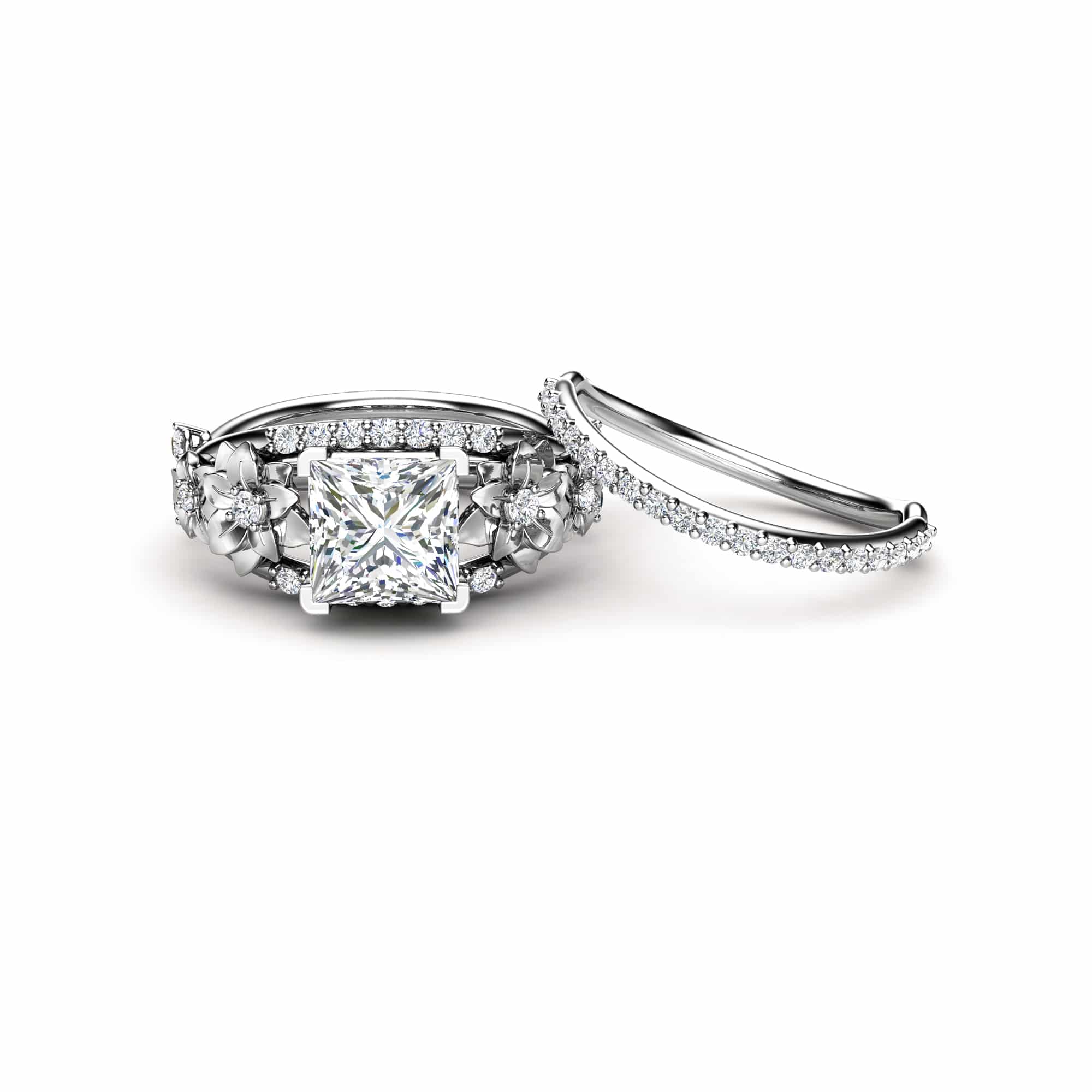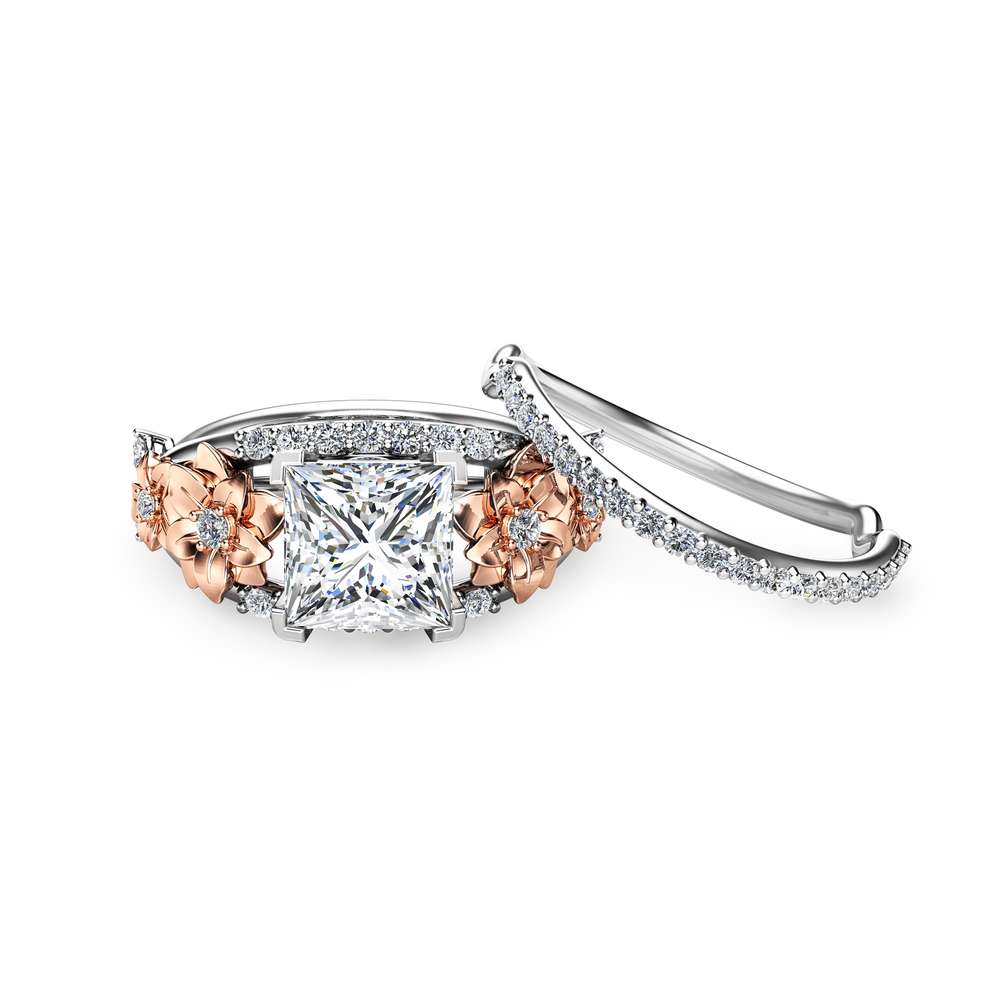 סט טבעות פרחוני דו־גוני זה עוצב כדי לבלוט ולרגש. טבעת המרכז משלבת יהלום מרובע נוצץ בליטוש מוקפד, המשובץ בתוך מסגרת מרשימה. סביבו מתעגלים עיטורי פרחים תלת־ממדיים בצורת עלי כותרת, המשתרעים לאורך כל גוף הטבעת. כל פרח מגולף בקווים מדויקים, ומרכזו משובץ יהלום קטן נוסף, היוצר תחושת עומק ויוקרה.